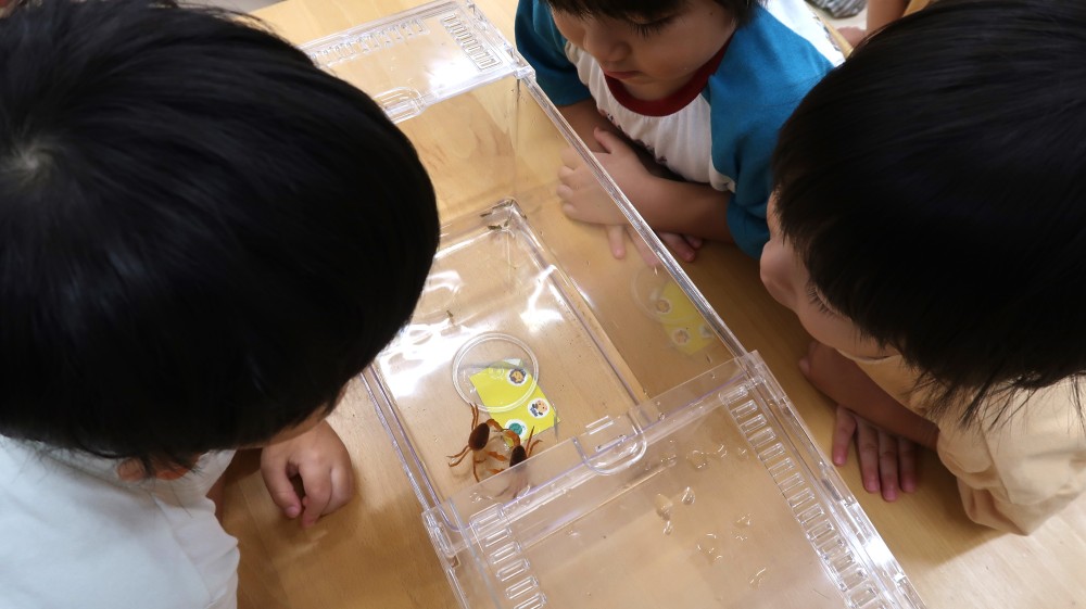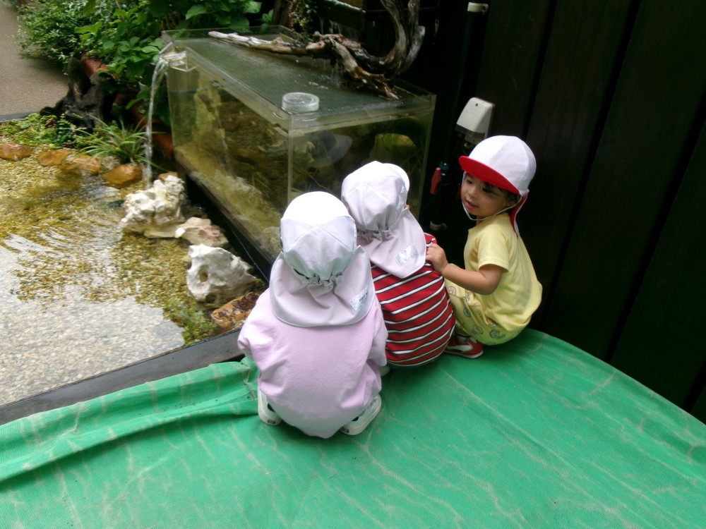 月に一度のビオトープメンテナンスの日。今日は、川で採ったサワガニを持ってきてくれました。水槽に入れる前にりす組さんに見せると興味津々に覗く姿が。手をチョキチョキさせたりしてカニを表現していた子もいました🦀