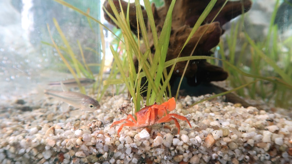 水槽に入れました。赤くて目につきやすいので子ども達も見つけやすいです。一緒に水槽にいるのは、安倍川で採った「ハヤ」。