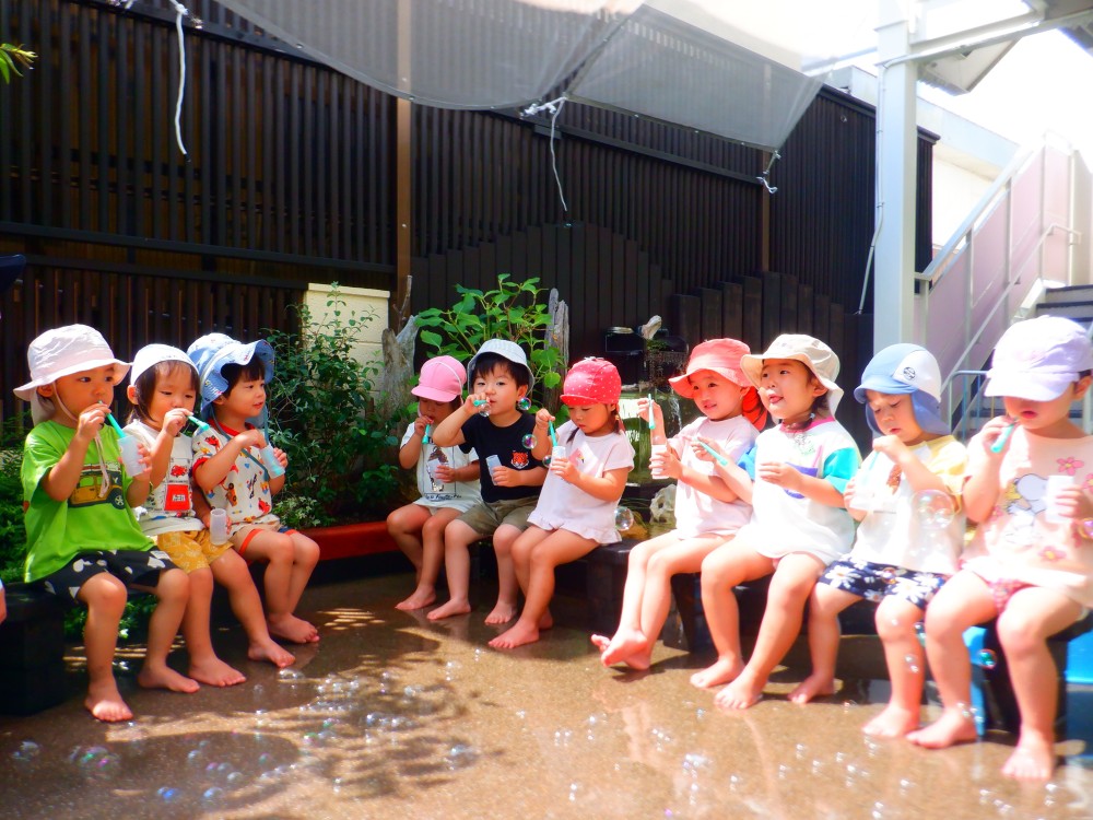 シャボン玉遊びや、咲いた朝顔を使っての色水遊びを通し、『面白い』『楽しい』『どうしてかな?』『もっとやってみたい』等