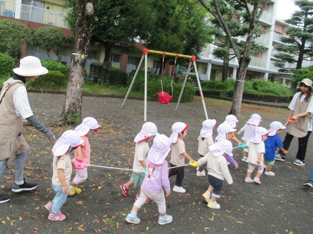 また、久々のお散歩では初めて誘導ロープを持って園外を歩きました。