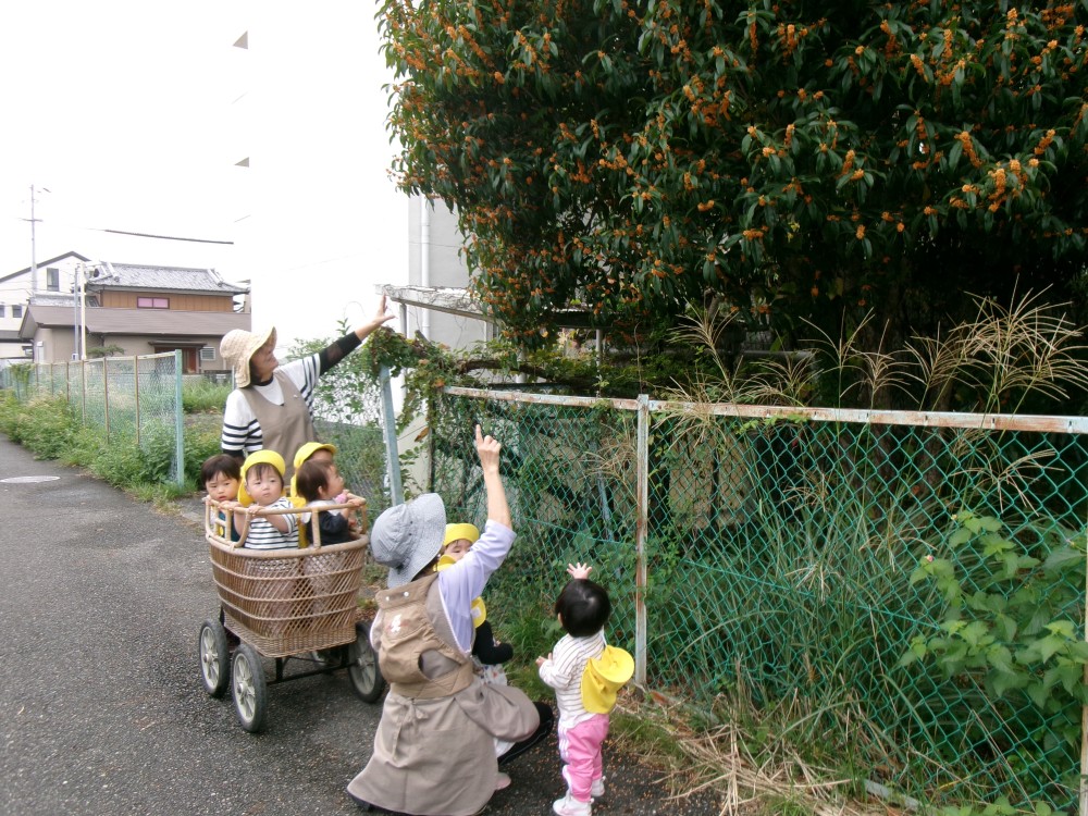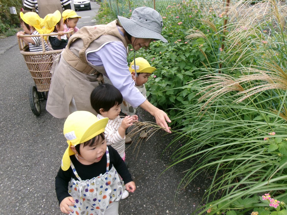 ようやくお散歩が気持ちの良い季節になりました。10月のひよこ組さんは久しぶりにお散歩にでかけ、キンモクセイがの匂いをかいだり、ススキを見つけて興味をもったりして秋の自然に触れていましたよ。春の頃は乳母車やベビーカーに乗っていましたが、最近は靴を履き保育者と手を繋いで歩き始めた子もいて、成長を感じます。