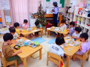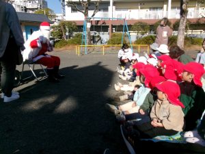 今月は寒い日もありましたが、りす組は元気いっぱい。室内で歌や楽器遊び、手遊びなどの表現遊びを楽しんだり、戸外で身体を沢山動かして遊びました。お弁当箱の日や、おひろめ会、楽しみにしていたクリスマス会にも参加し盛りだくさんの一か月でした。