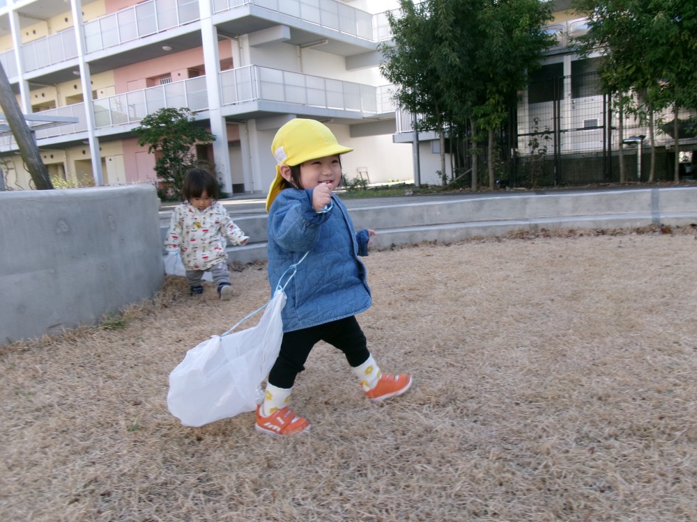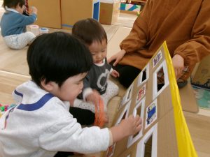 1月のひよこ組さんは、みんなの今年1年の健康を願って新年の集いやどんど焼きに参加したり、七草がゆを食べたりして日本の伝統文化に触れました。絵本で大好きな「だるまさんが」シリーズのだるまさんで「だるま落とし」を作ると、友達と一緒に高く積んだだるまさんを崩すことを繰り返し楽しんでいましたよ。キャッキャと嬉しそうな笑い声が聞こえてきました。また、暖かい日はお散歩へでかけ、ビニール凧あげをしました。保育者が凧を持って走ると嬉しそうに後を追っていましたよ。