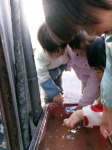 厳しい寒さが続きますね。子どもたちと銀色のコップに水を入れて園庭の様々な所に置いて、氷が出来るか実験しているのですが、その横にイチゴの花が咲いているのを発見!!寒さの側で、春の訪れがやってきているようです。