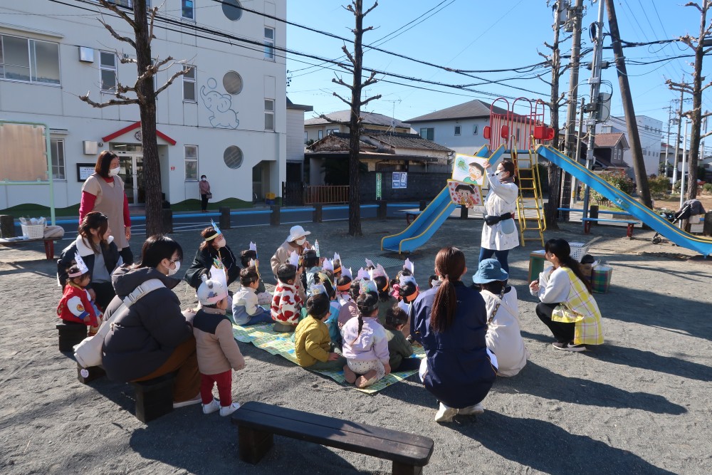 今日は暖かな日で良かったです。これまでの保育の中で節分や豆まきについて知ったり、自分のオリジナルのお面をつけ、カラーボールを使った豆まきごっこをしたり、今日の「節分の集い」まで楽しみながら子ども達の興味や関心、やる気を持ってきました。今日の鬼退治の豆まきは、子ども達から意欲を感じる良い投げっぷりでした!鬼退治をして邪気を払った後は「ふくはうち」ということで福の神が登場。みんながこの1年も元気で幸せに過ごせますようにと、福を持ってきました